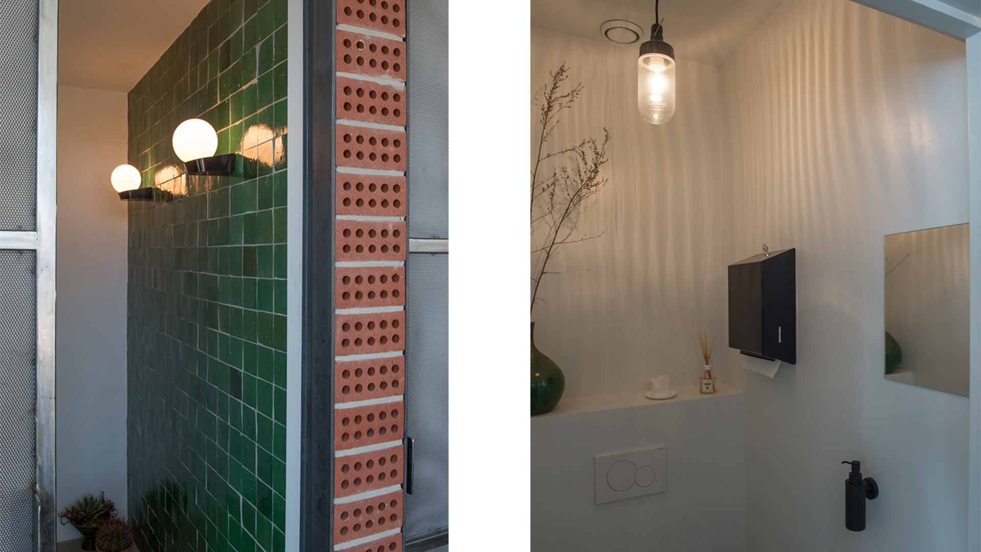 Old army lamps provide lighting above the green sofa.The walls behind the kitchen and the toilets are lined with aquamarine Moroccan tiles. The toilets and storage are accessible via steel door frames consisting of a two-layered perforated steel plate.