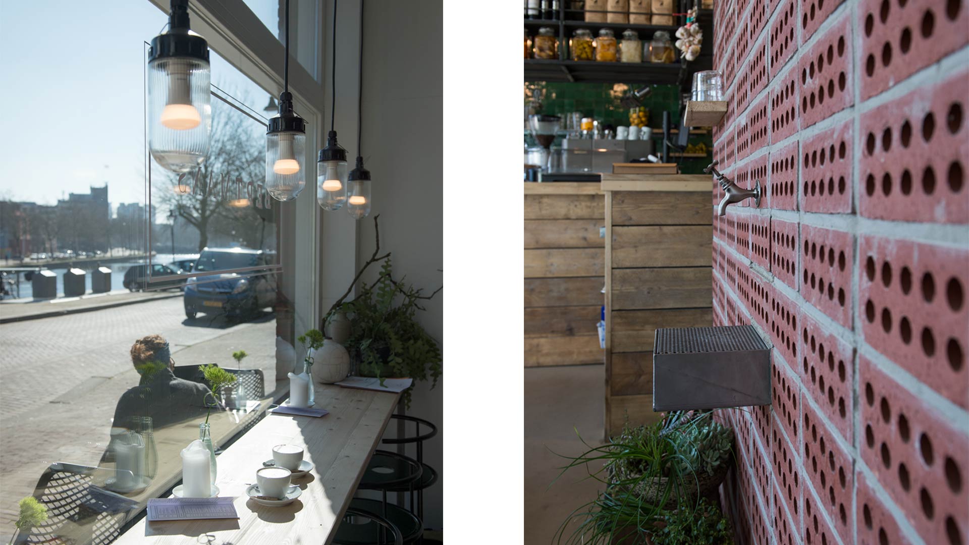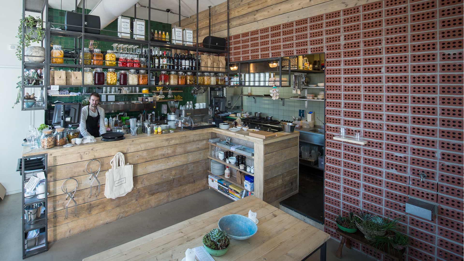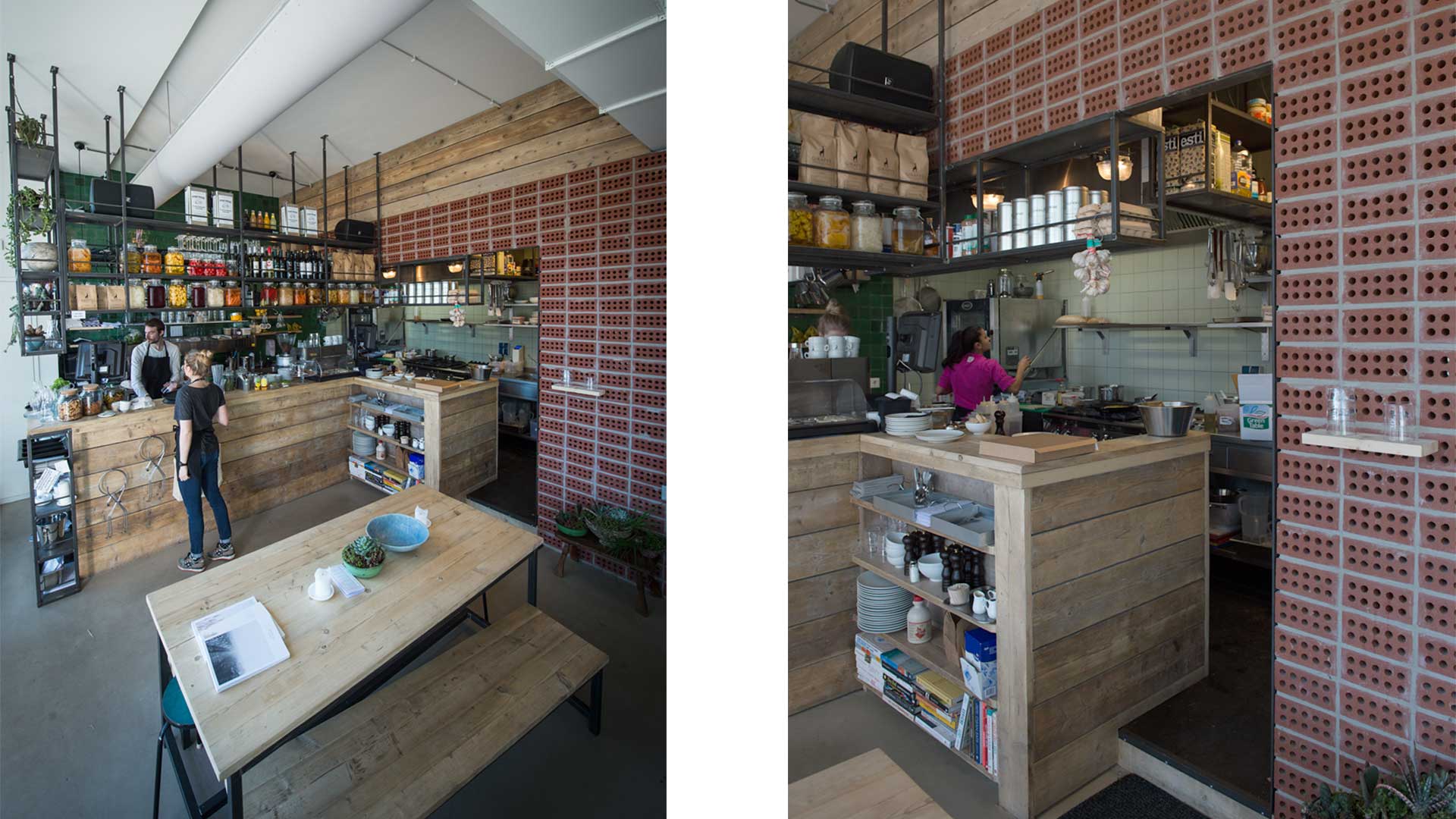 The assignment was to design an interior for this new establishment using materials to create an atmosphere which compliments this specific breakfast and lunch cuisine. To reflect the natural and organic nature of the restaurant, the architect chose four basic materials: steel, brick, distressed wood and Moroccan tiles.