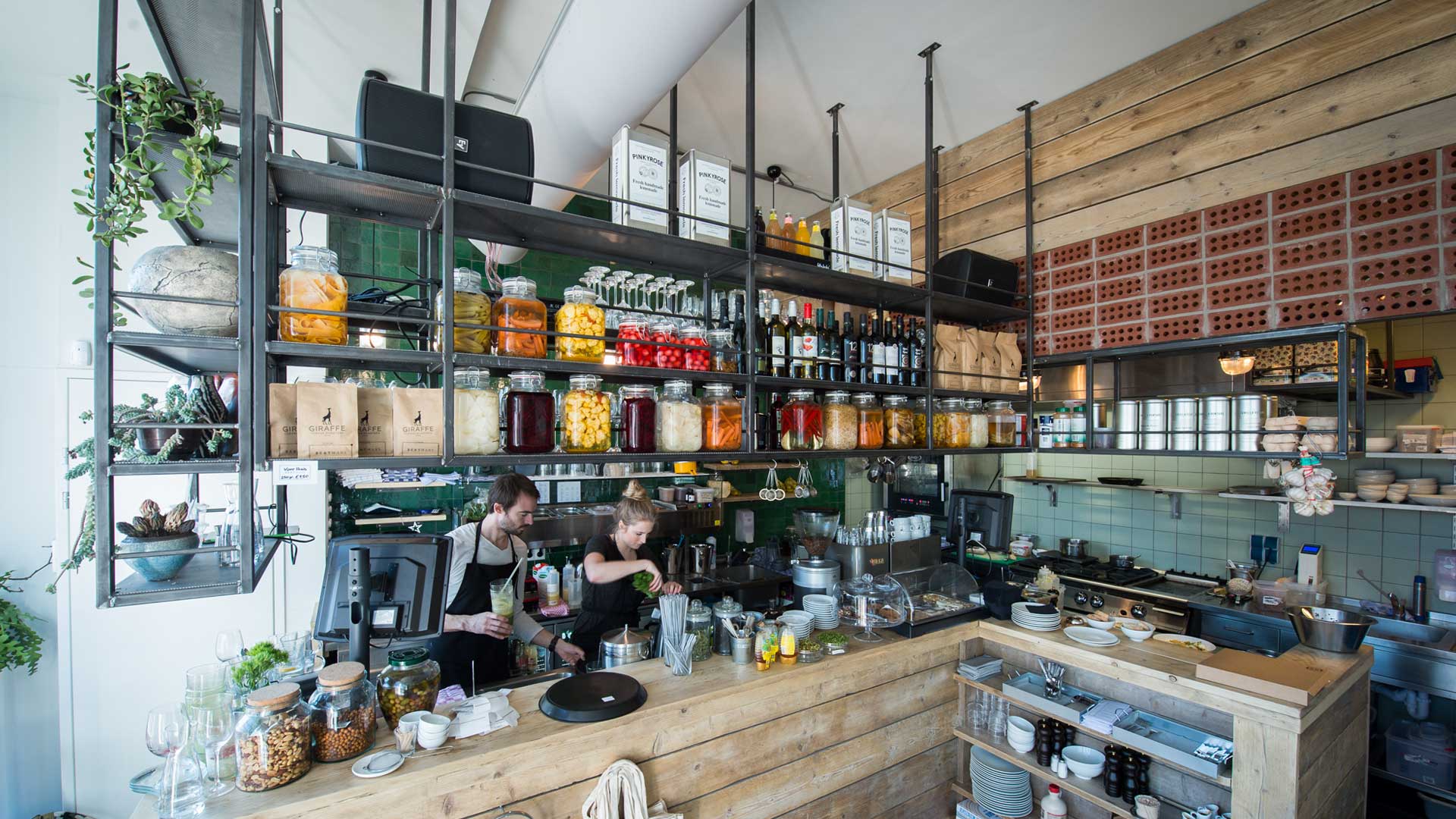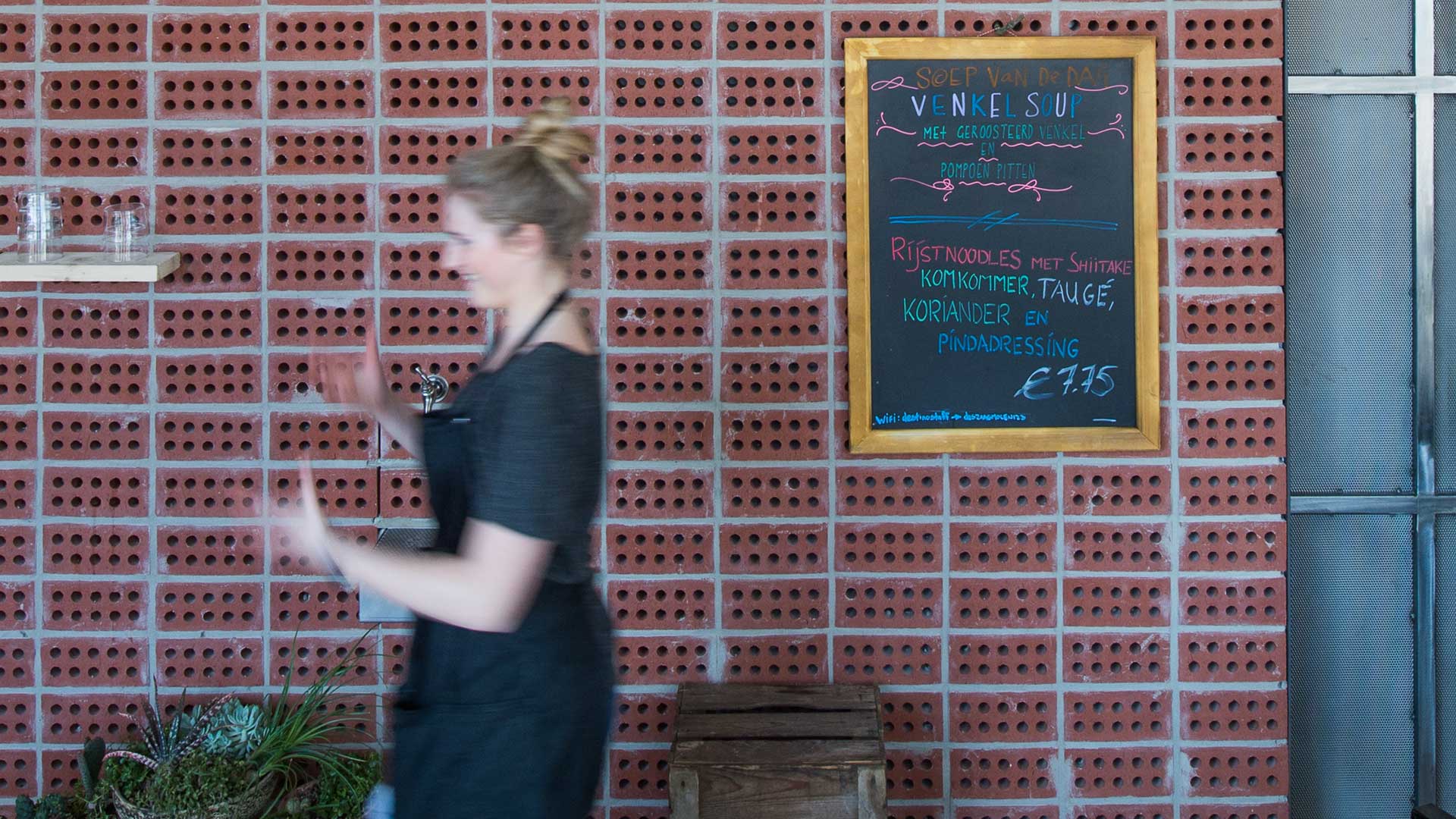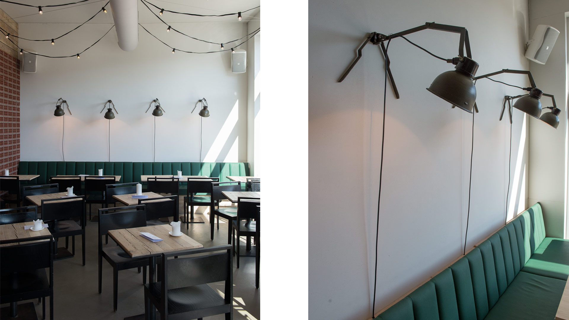 The assignment was to design an interior for this new establishment using materials to create an atmosphere which compliments this specific breakfast and lunch cuisine. To reflect the natural and organic nature of the restaurant, the architect chose four basic materials: steel, brick, distressed wood and Moroccan tiles.