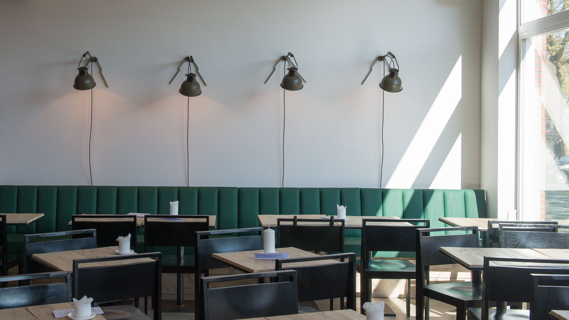 The interior rear wall of the restaurant, facing the wide windows of the facade, is largely made up of bricks and reflects the exterior bricks of the building. However the interior bricks are laid on their side and provide a decorative and acoustic effect. Because the bricks are not treated, the wall has a distinctive character and adds a special, warm feeling to the space.