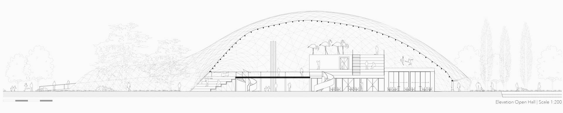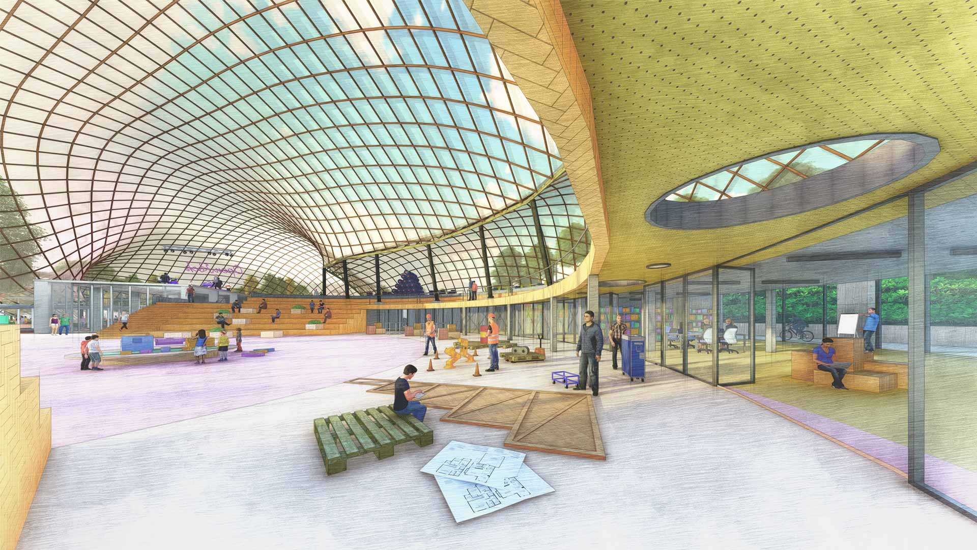 The largest hall will be used as an event space with workshops and labs located in its perimeter. A modular system allows the user to adjust the space to multiple situations. The modules can be used in other parts of the Multihalle, and even taken out to the neighbourhood or the city. Their human scale will encourage participation: the people can activate and transform the halls themselves.