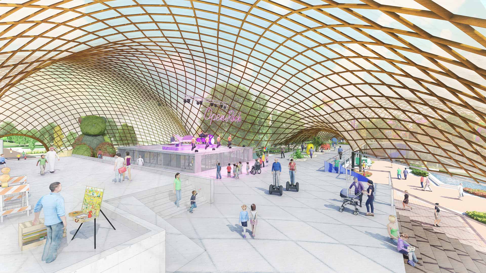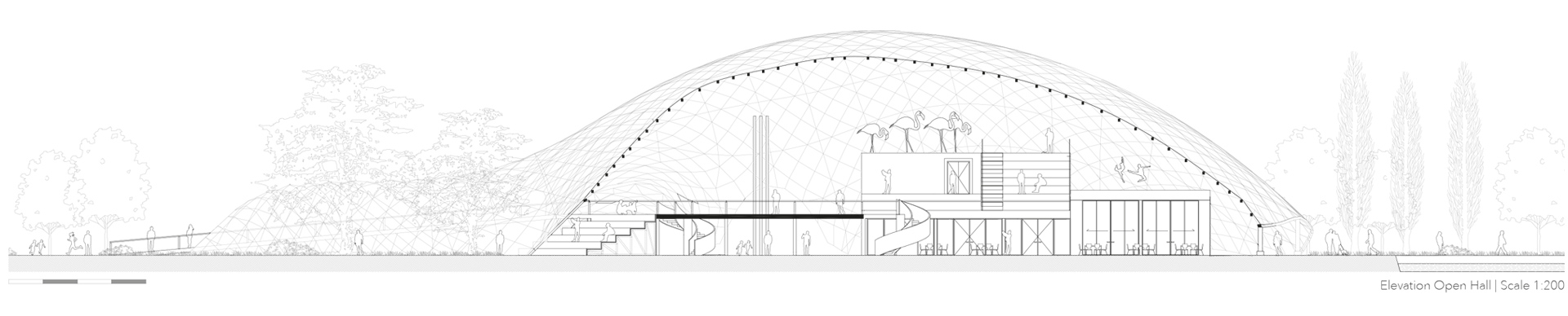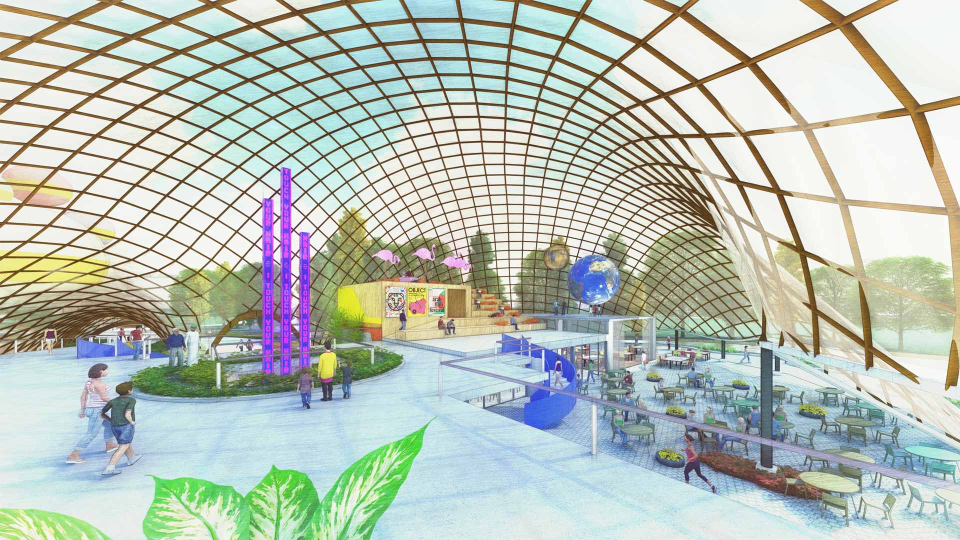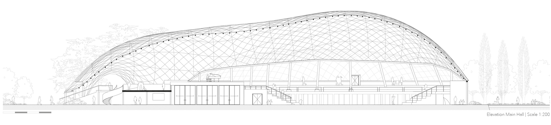 The transformative design focuses on reconnecting the Multihalle with the neighbourhood. A central urban avenue will cross the halls and encourage a dynamic coexistence of activities, generating a chain reaction of unique events. The diversity of the existing halls – covered, uncovered; vast, intimate; unmistakable, hidden… – is enhanced to incorporate the fluctuating identities of contemporary societies. A happy cultural landscape for an open society in harmony with itself and with nature.