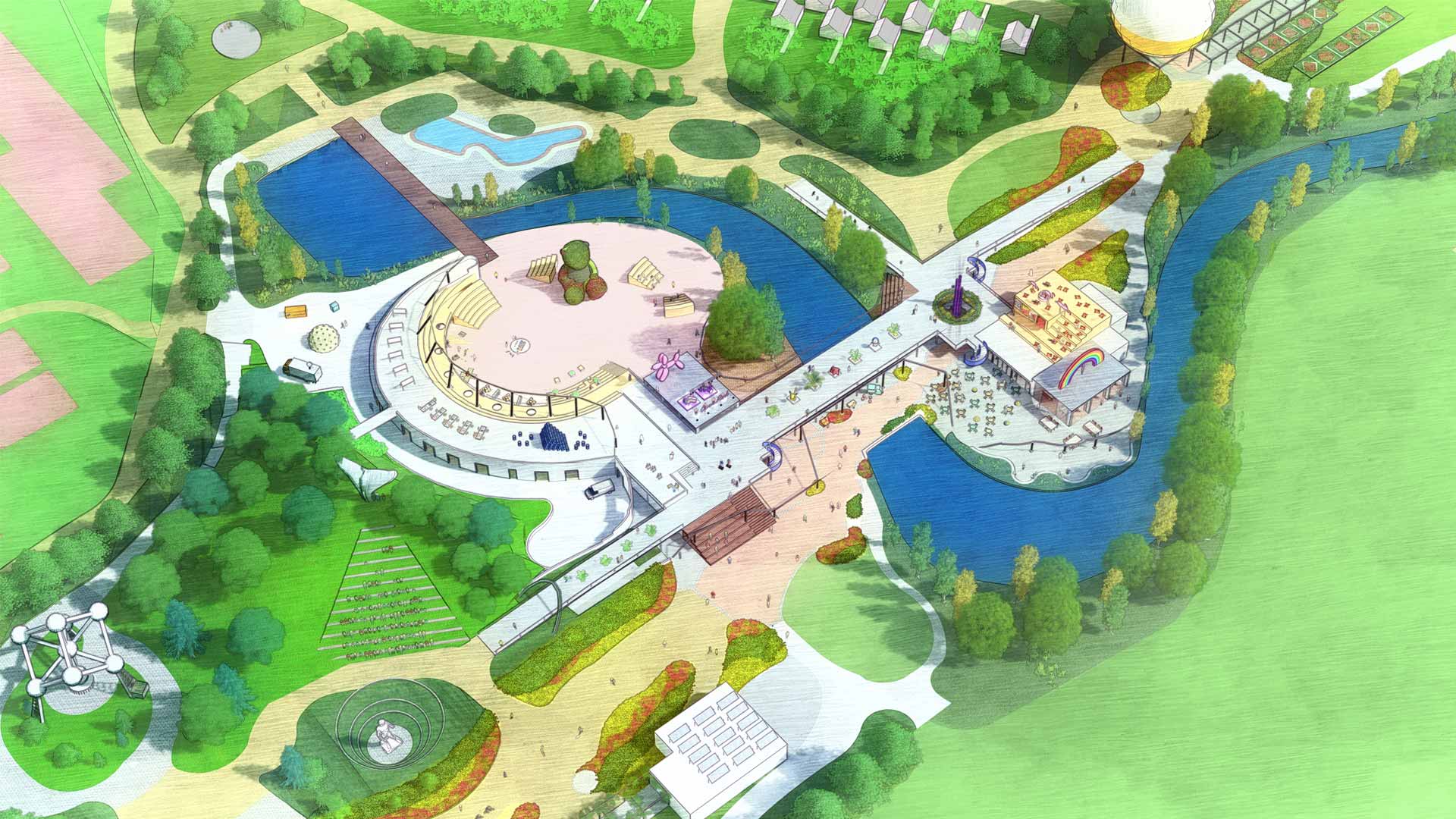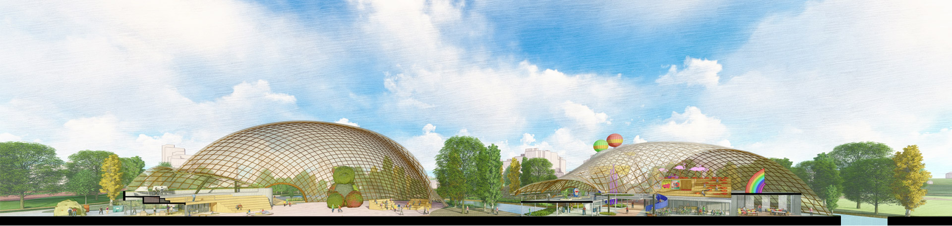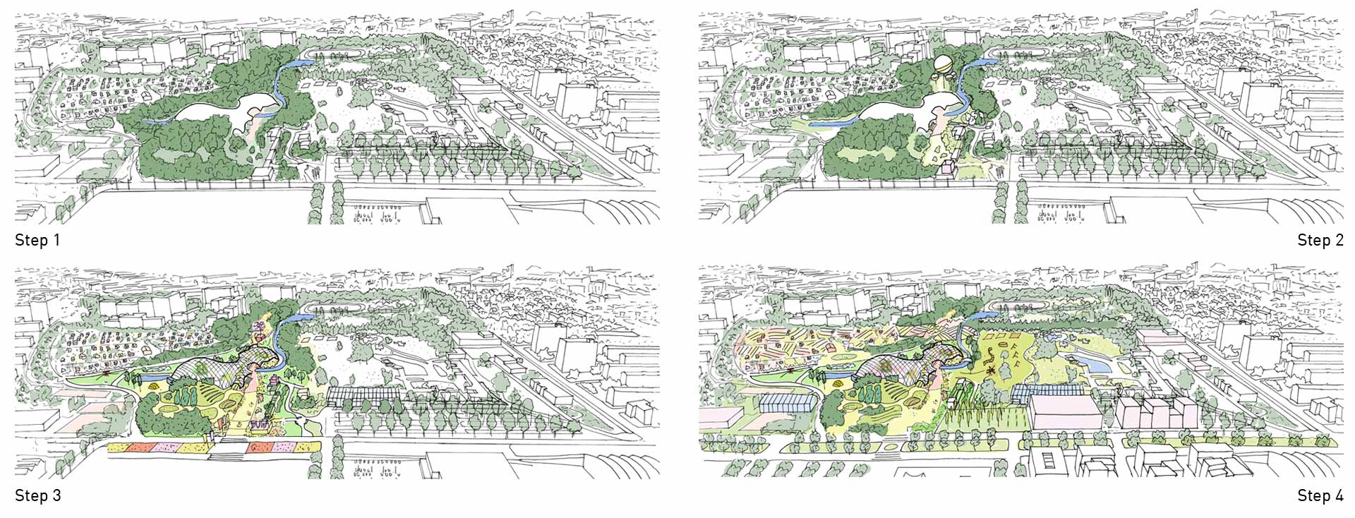 The transformative design focuses on reconnecting the Multihalle with the neighbourhood. A central urban avenue will cross the halls and encourage a dynamic coexistence of activities, generating a chain reaction of unique events. The diversity of the existing halls – covered, uncovered; vast, intimate; unmistakable, hidden… – is enhanced to incorporate the fluctuating identities of contemporary societies. A happy cultural landscape for an open society in harmony with itself and with nature.