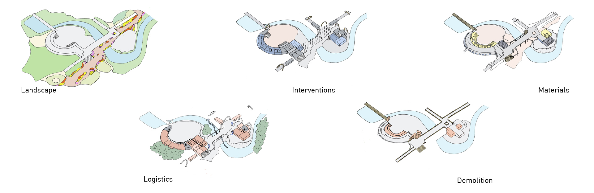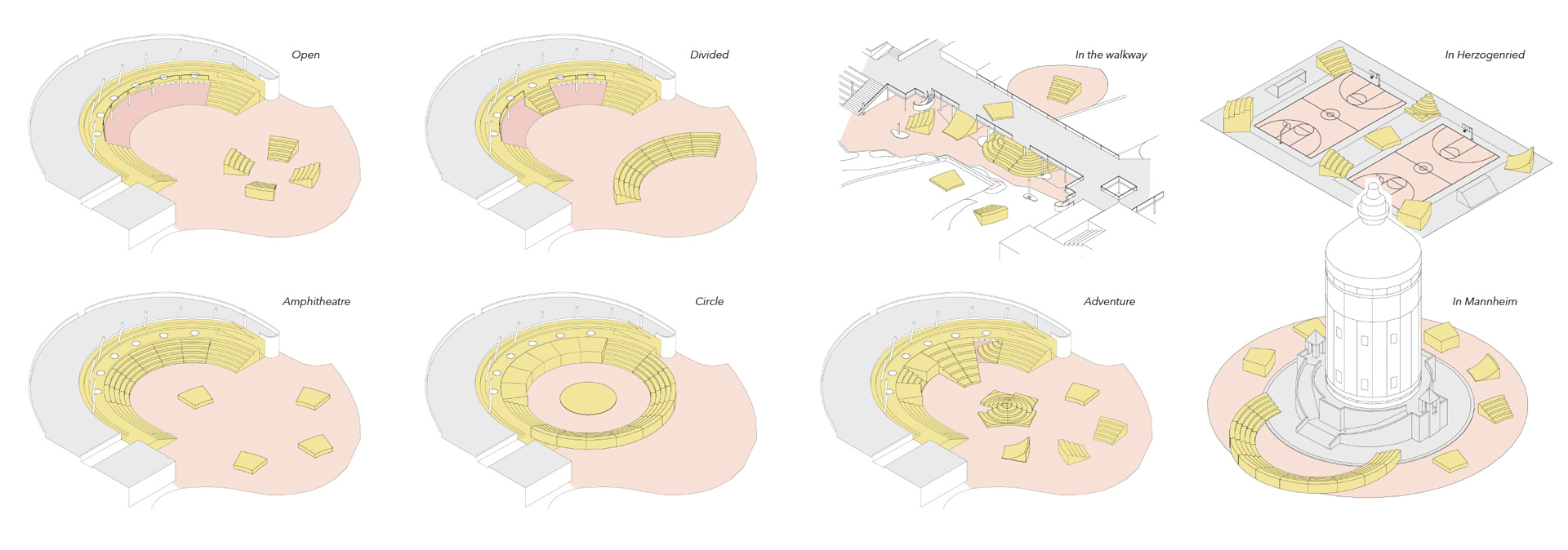 The Multihalle was designed for a specific event, the BUGA75. In order to make the halls active again, their features will be updated to promote multiple and unexpected uses. The initial interventions are strategically concentrated in a diagonal axis connecting the two main halls. This clear gesture maximises the interaction between different users and visitors.