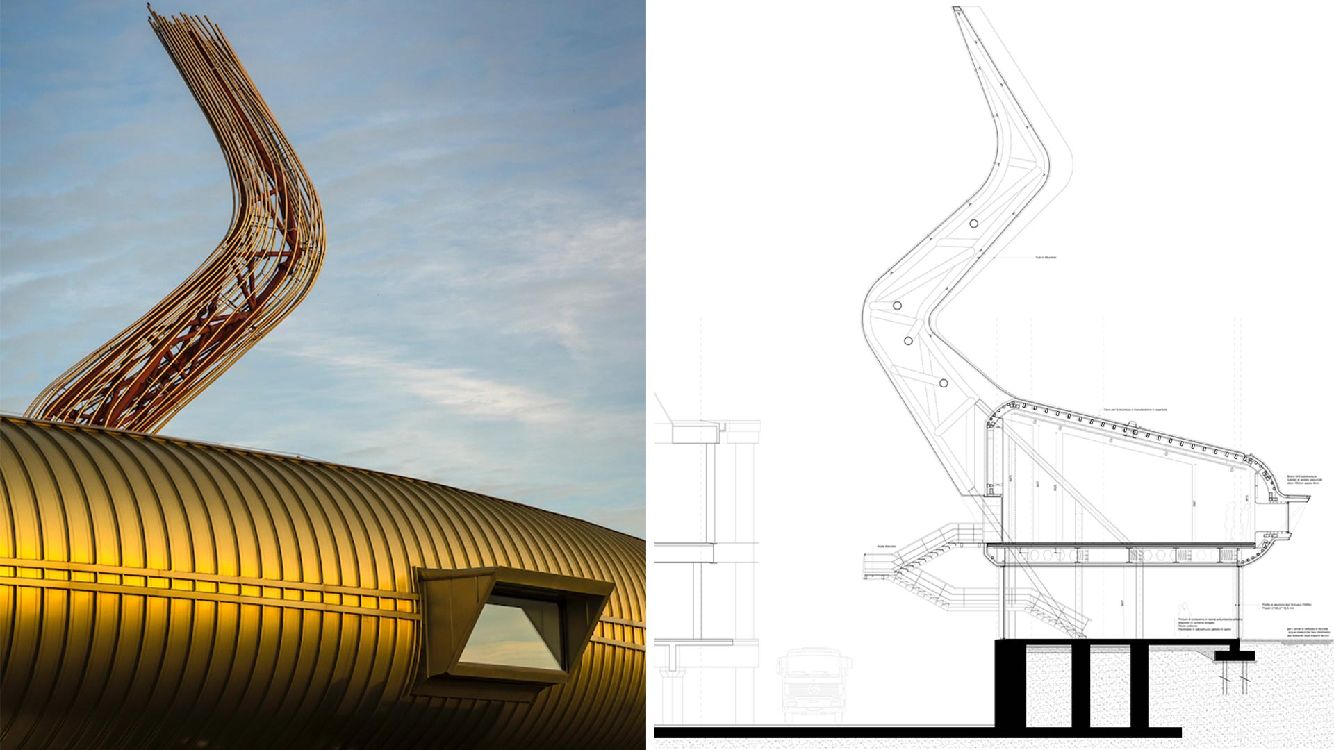 In contrast to the rather rigid, mechanical character of the existing museum building, which is inspired by the industrial textile halls of Prato, the new part looks elastic and ecstatic. It embraces the existing building and touches it only where necessary to enable the circuit to function. The considerable variation of the cross section of the exhibition floor creates spaces with different atmospheres – thereby allowing multiple exhibition possibilities. The tower looks like an antenna to the building. It acts as a landmark, but metaphorically it serves as a giant receiving instrument which gauges the cultural mood and seeks new trends for the museum.