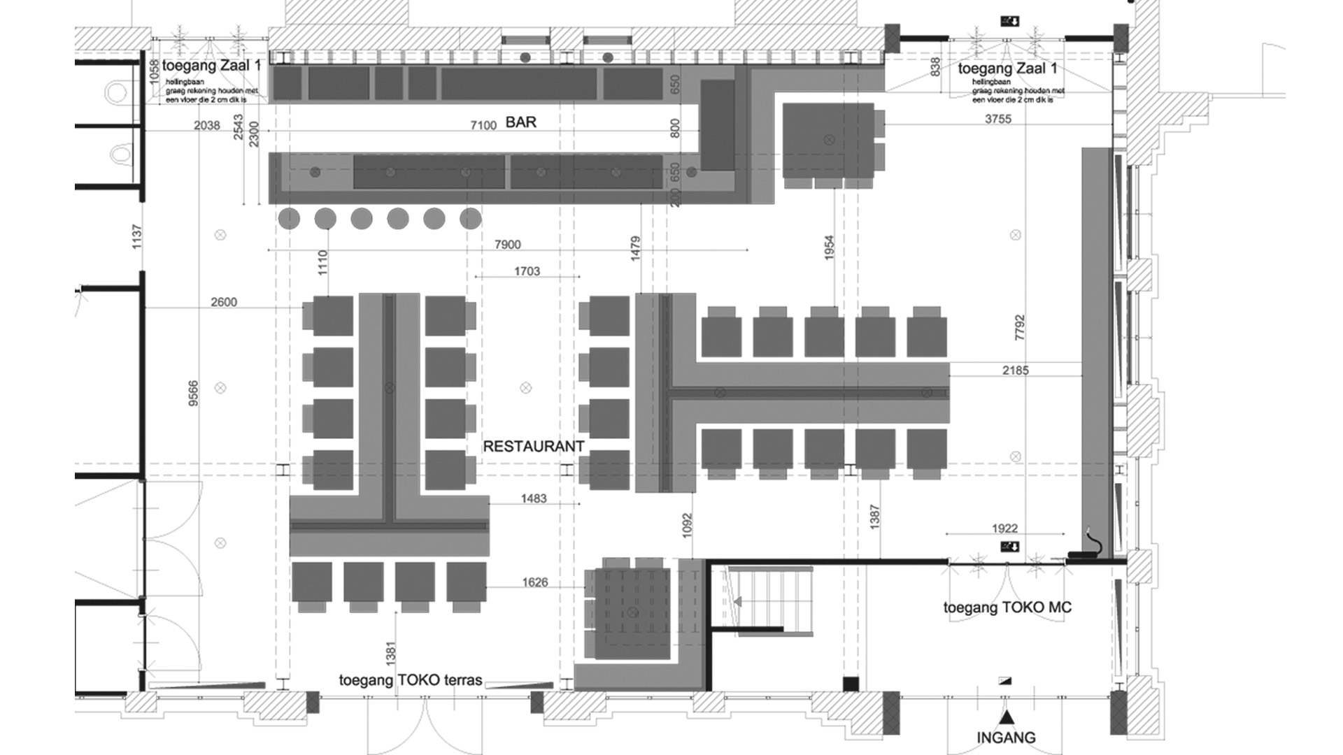 In the Zuiveringshal East a new theater has been built by Cosmic Foundation. The new theater is housed in three historic, industrial halls. One of the halls is leased to a restaurant called TOKO MC.