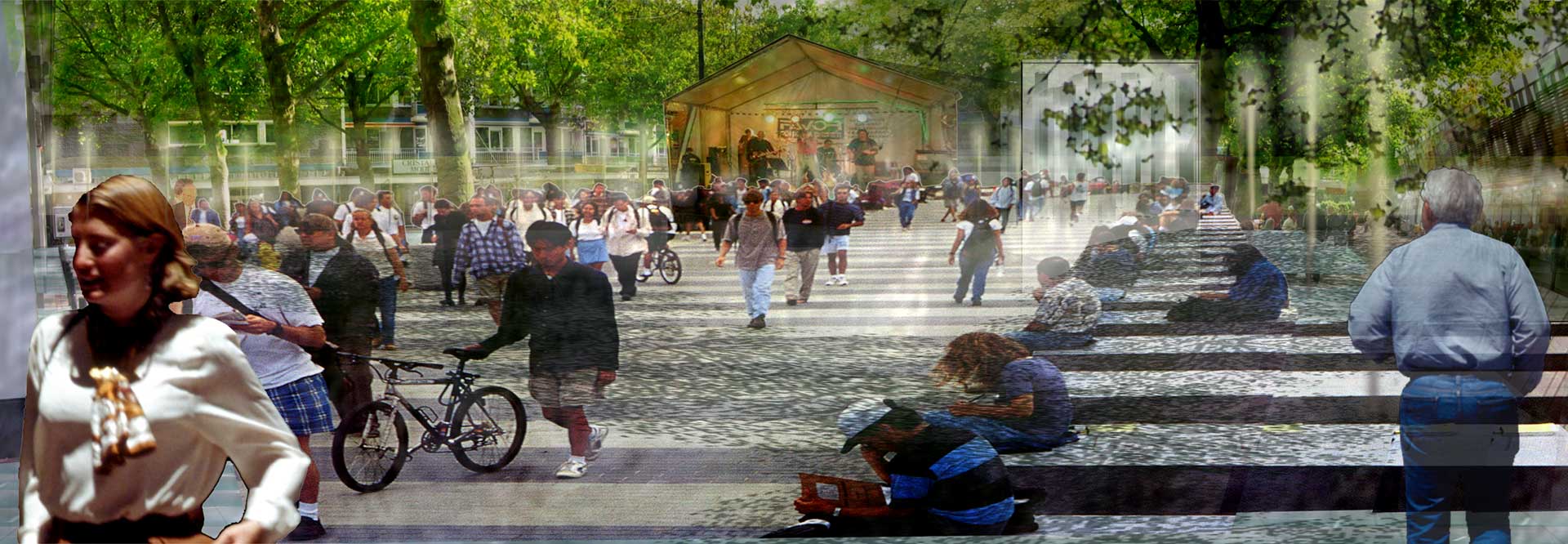 This mixture is a quality that we want to nurture, strengthen and continue with a new, forward-looking approach. The Veerplein is characterized by an interior space – a square within rows of trees – and an outdoor space – the space between the rows of trees and buildings. The square is therefore not really open, but neither is it really closed. There is no distinct transition from outside to inside and vice versa. This diffuses the experience of the square and its surroundings.