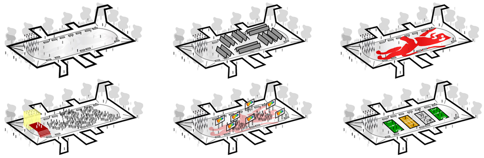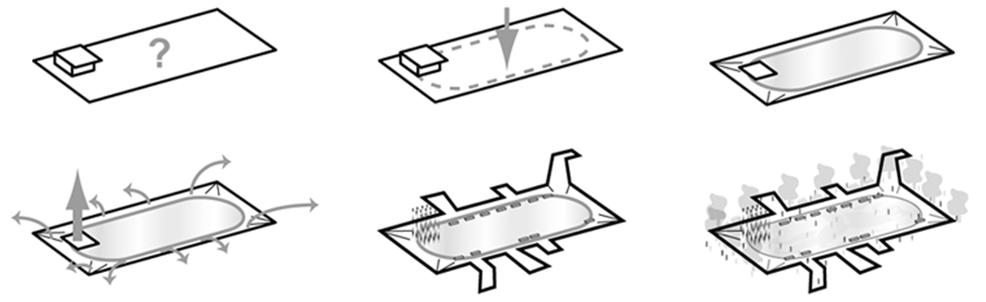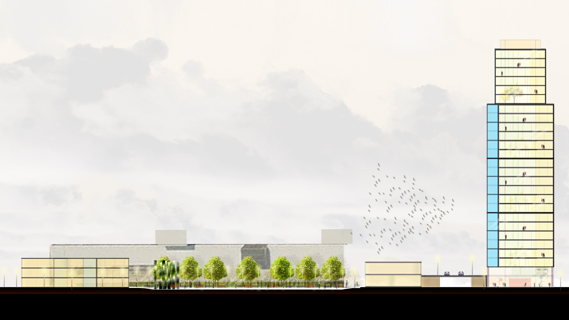The square will be lowered approximately 50 cm to correspond to the foundation of the Hospitality Pavilion. The existing foundation is the starting point for the new design and determines the framework of the new intervention. The square will be treated with a reflective coating in a grid of 21 x 32m. Provisions are made for electricity within that grid. Rows of trees sit on three sides of the square, and additional trees will be planted on the fourth, southwest side where the library is located.